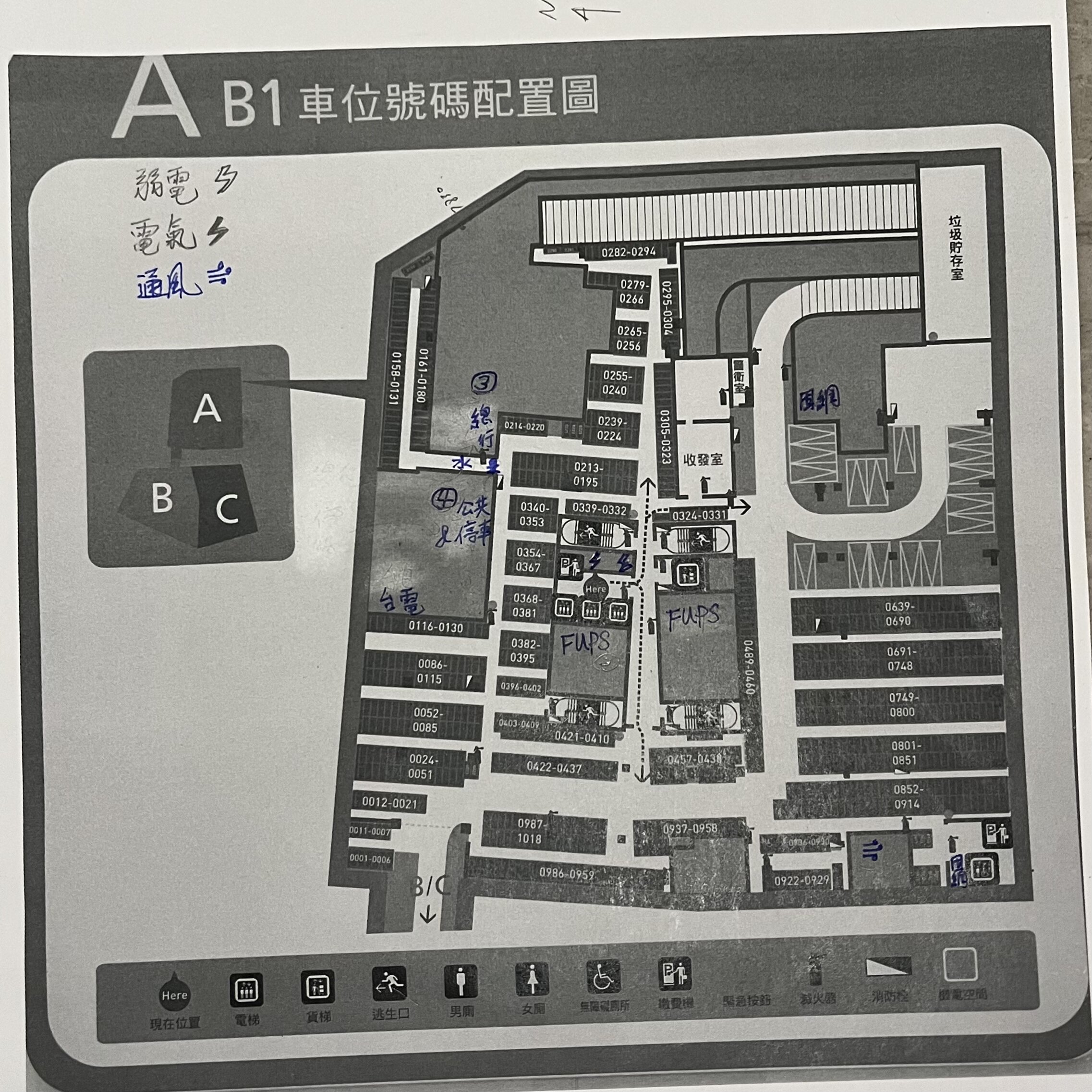 A 棟 B1F 停車場,手寫標注:弱電(多)、電氣(多)、通風(≡);FU.PS(UPS)位置標記於中段。