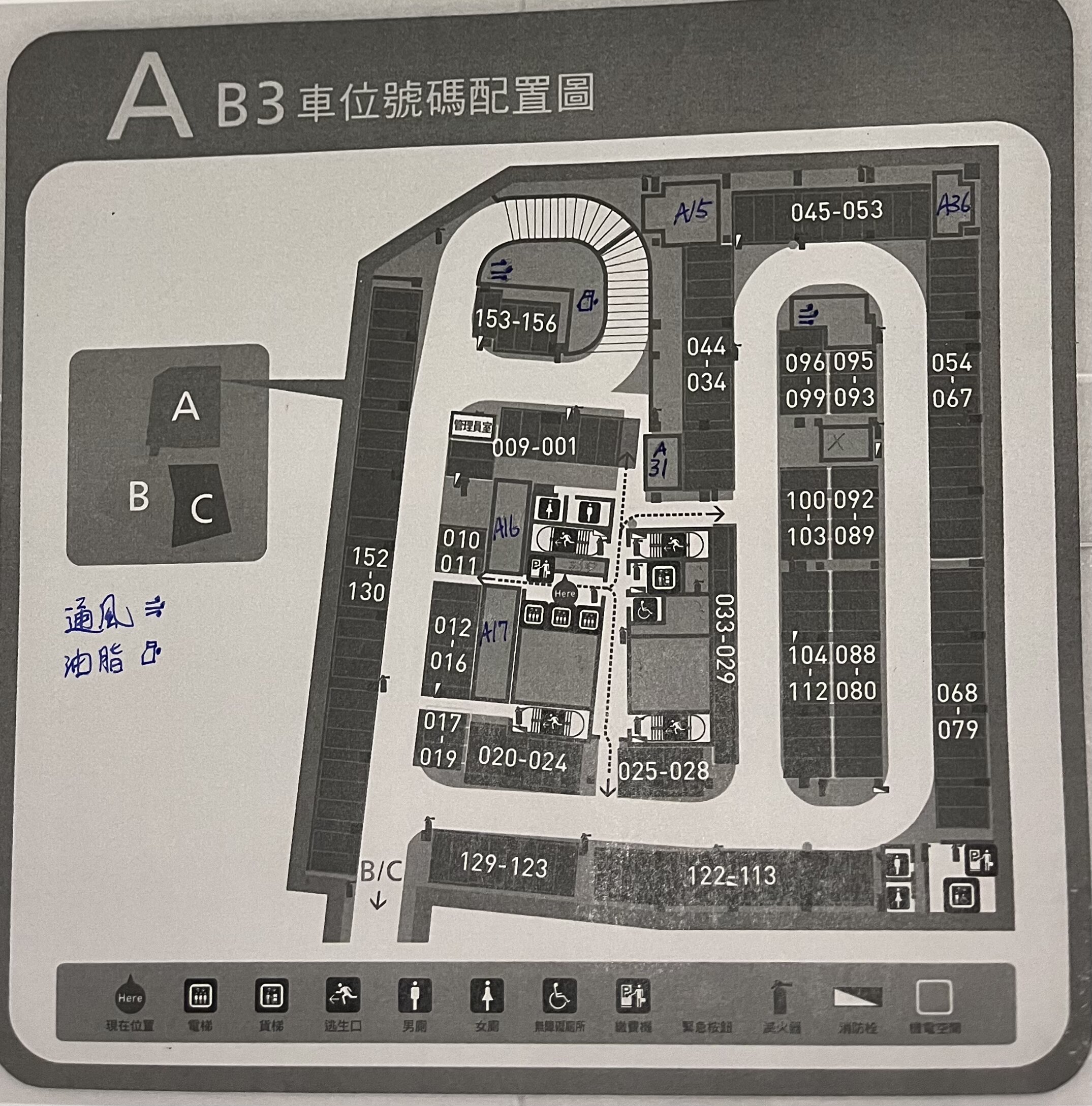 A 棟 B3F,手寫標注:通風(≡)、油脂(⊙)。