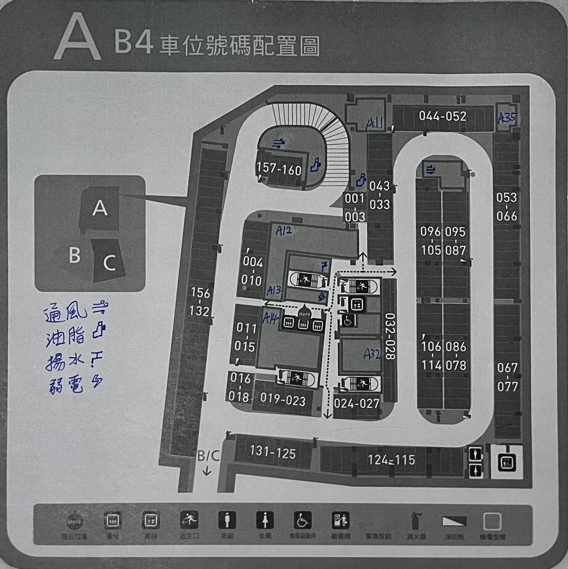 A 棟 B4F,手寫標注:通風(≡)、油脂(⊙)、揚水下、弱電(多)。