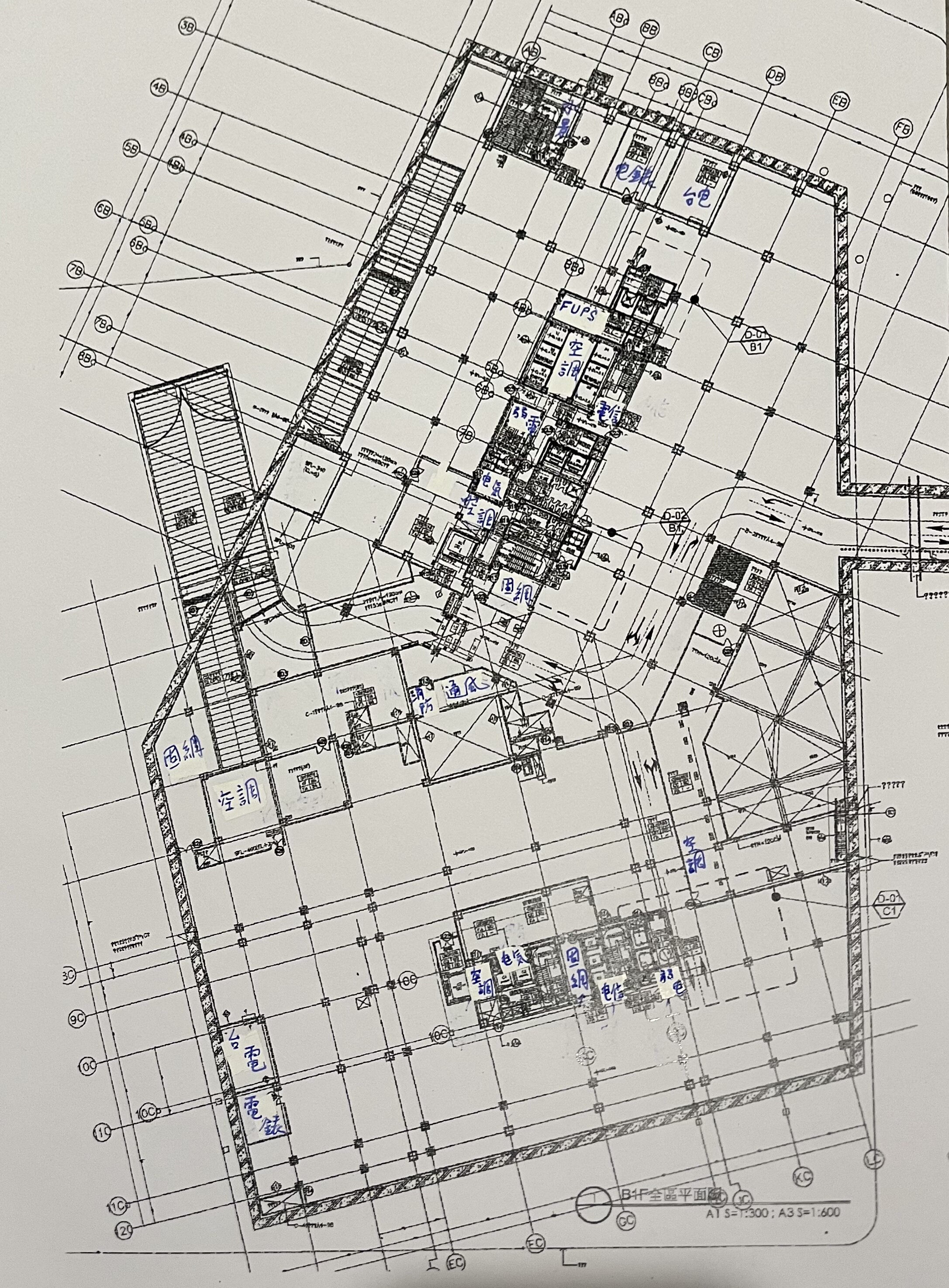 工程圖比例 A1 1:1300 / A3 S=1:600,手寫標注設備類型:通風、FUPs(不斷電設備)、空調站、油庫、弱電、電氣。
