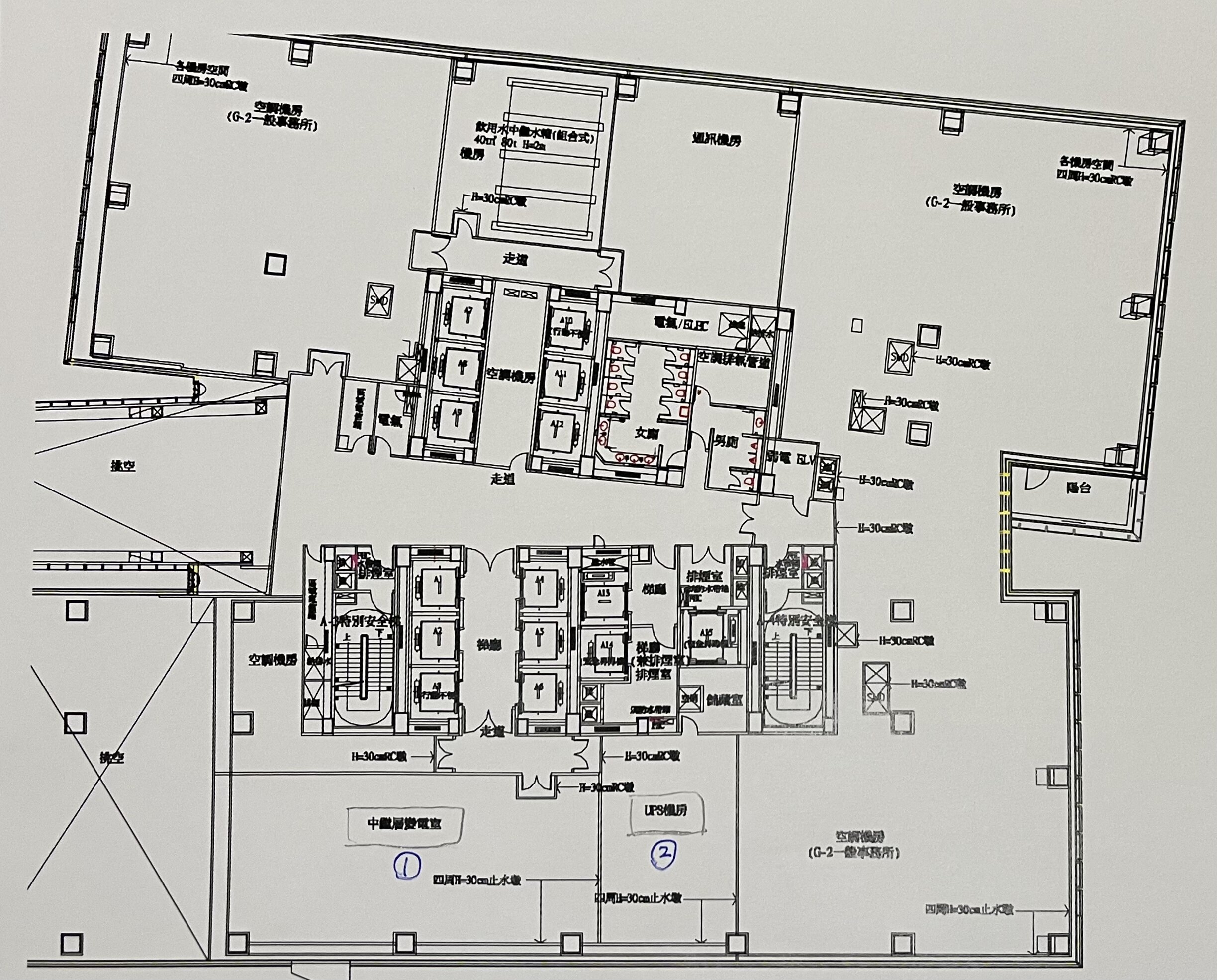 - 底部:中壓游離電室 ①(四組 H-30cm DK 水塔)、中壓游離電室 ②(六組 H-30cm DK 水塔)、UPS 機房